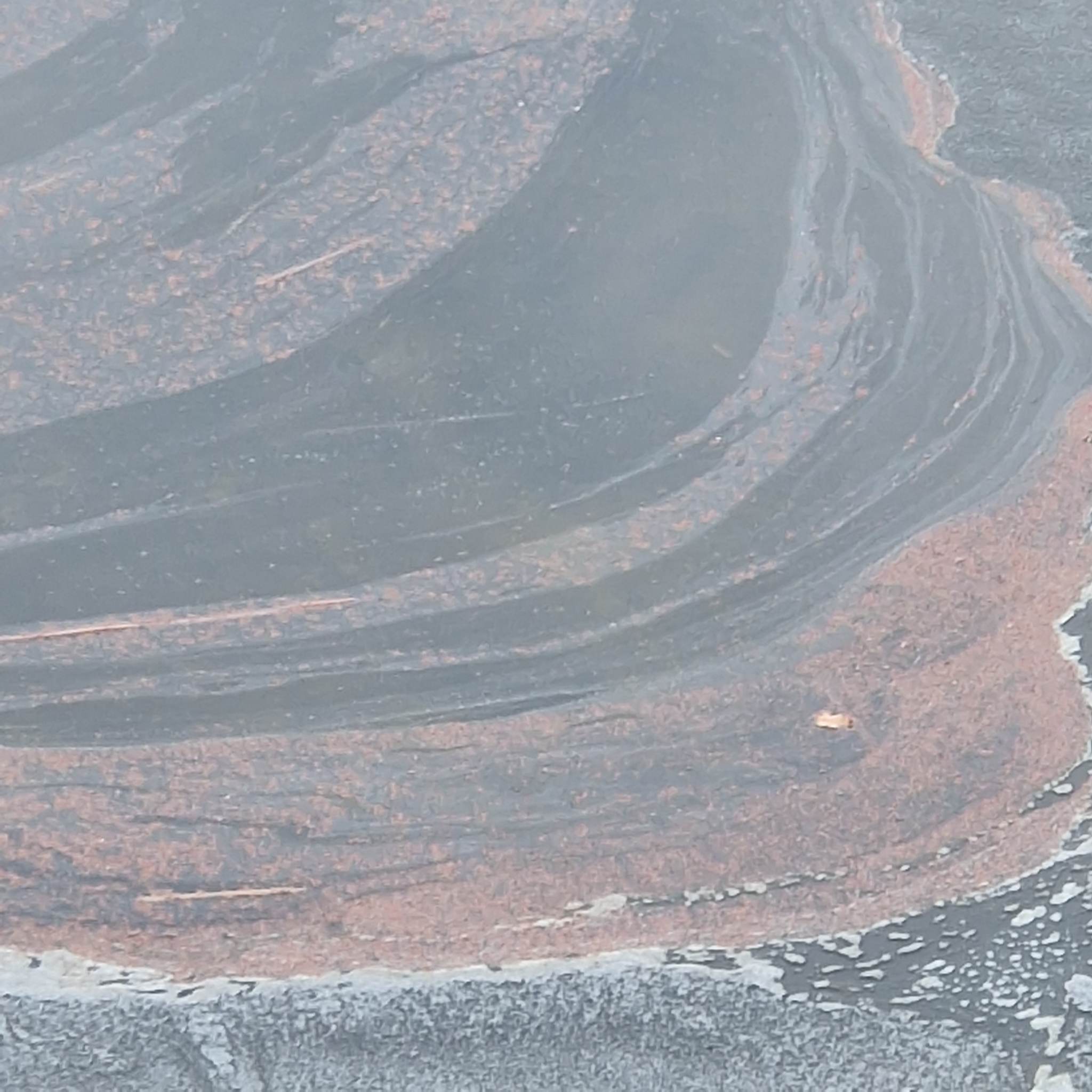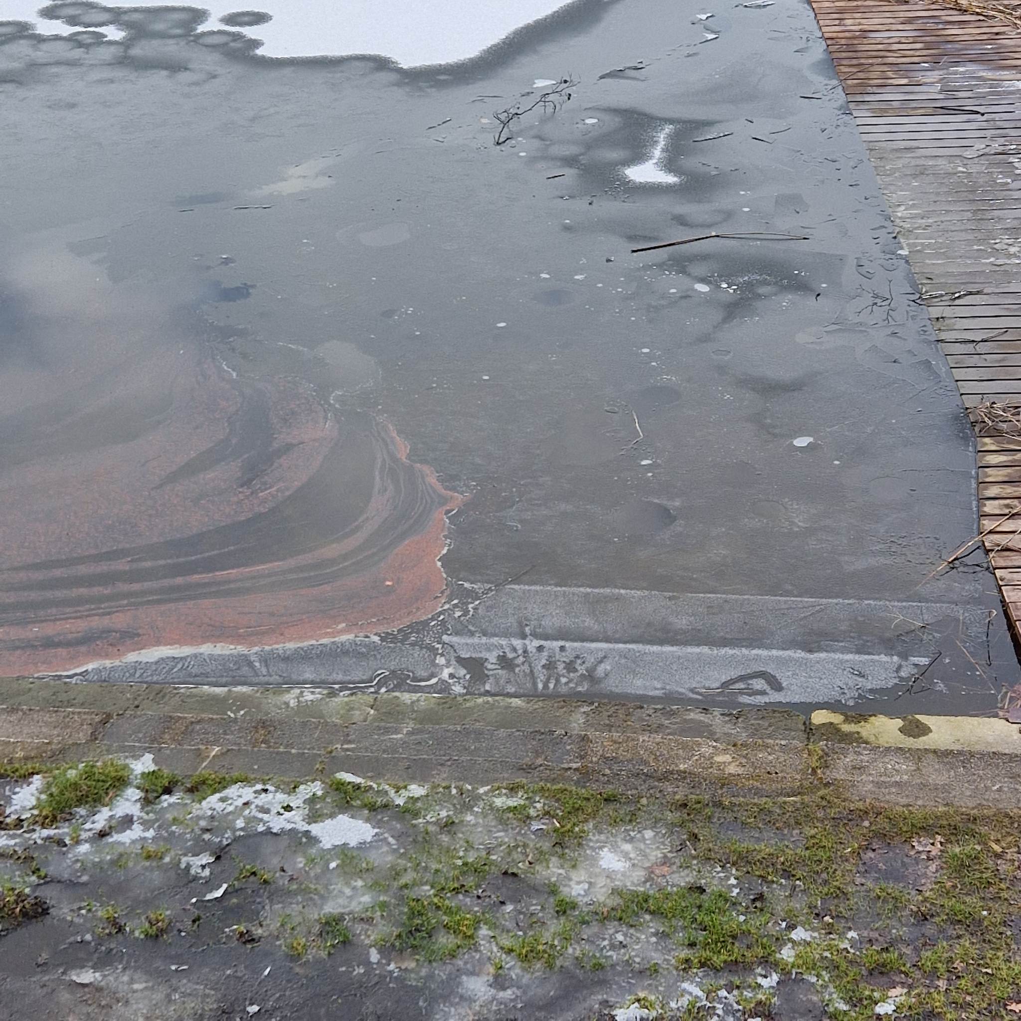 Na fotografiach widać brązową maź pływającą na powierzchni wody jeziora. Wygląda jak farba, którą pomalowano deski pomostu.