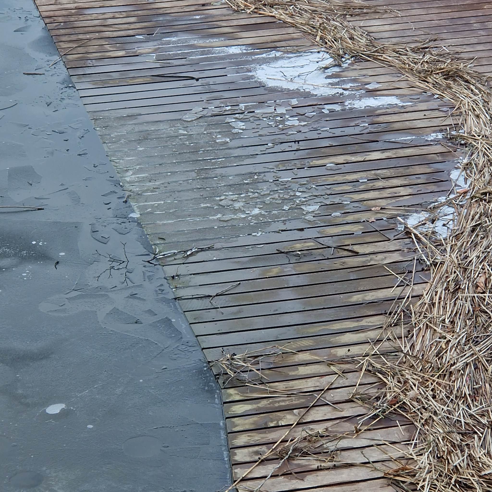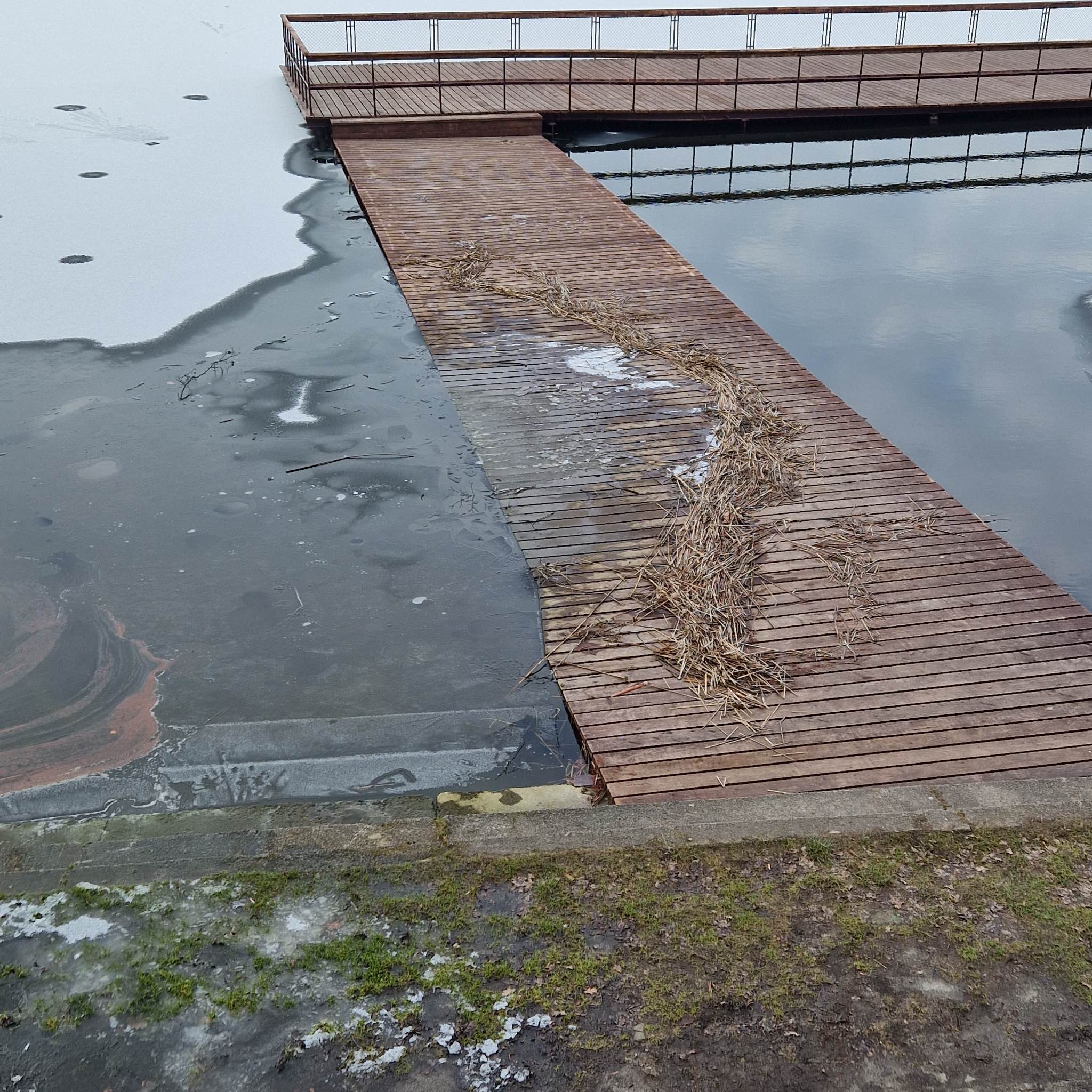 Nowo wyremontowany pomost w Miałkówku za prawie 210 tyś. Pomalowane deski zaczyna zmywać deszcz.