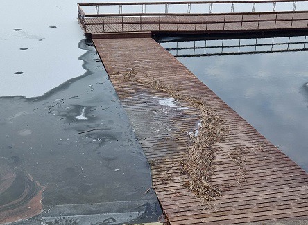 Nowo wyremontowany pomost w Miałkówku za prawie 210 tyś. Pomalowane deski zaczyna zmywać deszcz.