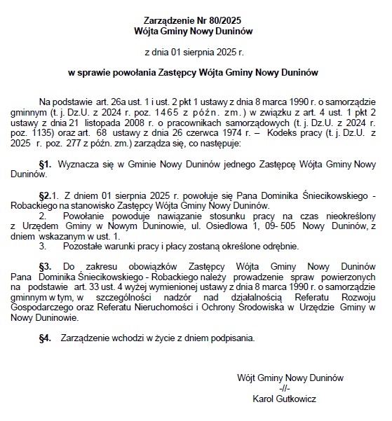 Z dniem 1 sierpnia 2025 roku stanowisko Zastępcy Wójta Gminy Nowy Duninów objął Dominik Śniecikowski-Robacki – były kandydat na burmistrza Miasta Gostynina oraz działacz lokalny związany z ugrupowaniem Nowa Nadzieja Gostynin.