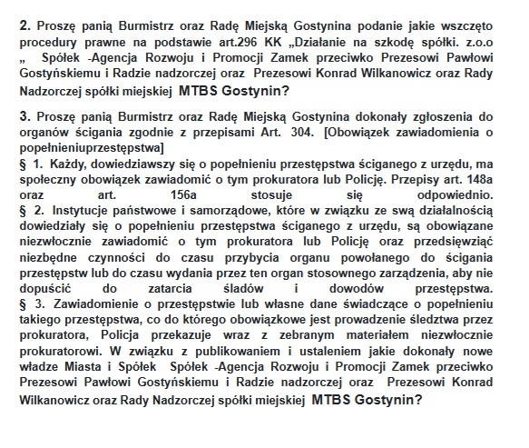 W dniu 17/02/2025 otrzymaliśmy odpowiedzi na zadane pytania. Publikujemy zadane pytania, aby mieszkańcy i podatnicy zobaczyli, jak nowa władza rozlicza poprzedników, czyli PiS. Czytając odpowiedzi mimo wysłuchania nowych władz Miasta Gostynina o stanie zadłużeń, jakich dopuścili się ludzie władzy PiS. W wywiadach publikowanych formie Video i artykułach na portalach jasno określono kwoty zadłużeń i wychodziło, że Burmistrz jako Organ Nadzorujący jednak zajmie stanowcze stanowisko w sprawie rozliczeń PiS tak jak to robi Obecny Rząd Polski!    Otrzymana odpowiedz:   Jako podatnik i mieszkaniec jestem zdziwiony brakiem zgłoszenia o podejrzeniu popełnieniu przestępstwa, zwłaszcza że na portalach i FB nagłośniono to bardzo mocno!  O tym jak nowa władza narzekać zaczęła na zadłużenia po byłej władzy PiS , przeczytać można w linkach poniżej: żródło:Gostynin.info https://gostynin.info/informacje/gigantyczne-zadluzenie-spolki-zamek-gostyninski-to-nie-koniec-problemow-zdjecia/   https://gostynin.info/informacje/burmistrz-pawel-kalinowski-pozostawil-ponad-18-milionow-zadluzenia/ Źródło Foto:Gostynin.info Według najnowszych danych, zadłużenie spółki osiągnęło astronomiczną kwotę 395 109,70 zł. To jednak nie koniec problemów. Jak poinformował radny Kamil Nowogórski już w dniu 31 Lipca 2024 na portalu Gostynin.info : Rafał Nowogórski podkreślił długotrwały charakter problemów finansowych: „Ostatnim rokiem, w którym ARiP Zamek nie przyniósł na koniec roku straty, jest rok 2016. Ostatnie 9 lat spółka regularnie była źródłem straty dla miasta, mimo iż była wielokrotnie dokapitalizowywana.” już wtedy nowa pani Burmistrz oraz urzędnicy w naszym mieście mieli wiedzę o podejrzeniu popełnienia przestępstwa, Nic nie zgłosili od Prokuratury, lub innych organów ścigania  do dnia 23/02/2025.   Przypominam nowej władzy, że mają obowiązek Urzędniczy zgłaszania wszelkich takich podejrzeń, a nie tylko wykorzystywania do promowania swego ugrupowania IDG i PO w oczach mieszkańców! Nie ma zgody Mieszkańców na obciążanie ich z podatków na nieudolne zarządzanie Prezesów, którym wypłaty też robiono z kasy Budżetu Miasta Gostynina. W rozmowach z mieszkańcami jasno słychać niezadowolenie, że mimo wyboru nowej władzy pieniądze na obdłużanie nie idzie od tych, co do tego doprowadzili, ale znowu z kieszeni mieszkańca. Obowiązek zawiadomienia o popełnieniu przestępstwa – Kodeks postępowania karnego Art. 304 & 2. Złożenie zawiadomienia o przestępstwie przez instytucję państwową (samorządową) Zawiadomienie o przestępstwie jest pisemną lub ustną informacją osoby fizycznej, instytucji państwowej, samorządowej lub społecznej, skierowaną do organów ścigania (prokuratora, Policji lub innego organu uprawnionego do prowadzenia dochodzenia) o fakcie popełnienia przestępstwa. Może ono stanowić podstawę wszczęcia śledztwa lub dochodzenia. Prawny obowiązek zawiadomienia o przestępstwie ściganym z urzędu – z mocy art. 304 § 2 k.p.k. – ciąży na instytucjach państwowych i samorządowych. Instytucjami państwowymi są organy władzy, organy administracji rządowej (ogólnej i szczególnej), organy wymiaru sprawiedliwości (sądy i trybunały), inne organy państwowe (NIK, Rzecznik Praw Obywatelskich, Krajowa Rada Radiofonii i Telewizji, prokuratura), a także instytucje sprawujące funkcje z zakresu zarządu państwowego, np. ZUS. Instytucje samorządowe to organy samorządu terytorialnego i samorządu zawodowego, np. izby lekarskie. Takiego obowiązku nie ma instytucja społeczna, mimo że należy ją zawiadomić o wszczęciu, odmowie wszczęcia albo o umorzeniu śledztwa lub dochodzenia, jeśli złożyła zawiadomienie o przestępstwie (art. 305 § 4). Czytaj więcej w Systemie Informacji Prawnej LEX: https://sip.lex.pl/procedury/zlozenie-zawiadomienia-o-przestepstwie-przez-instytucje-panstwowa-samorzadowa-1610613903